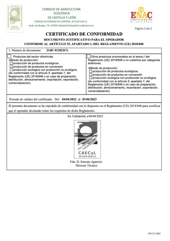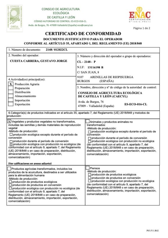 Todos nuestros productos están certificados por la CAECyL, que es la Autoridad Pública de Control de Certificación de la Producción Ecológica en Castilla y León, conforme al Reglamento (CE) 834/2007.